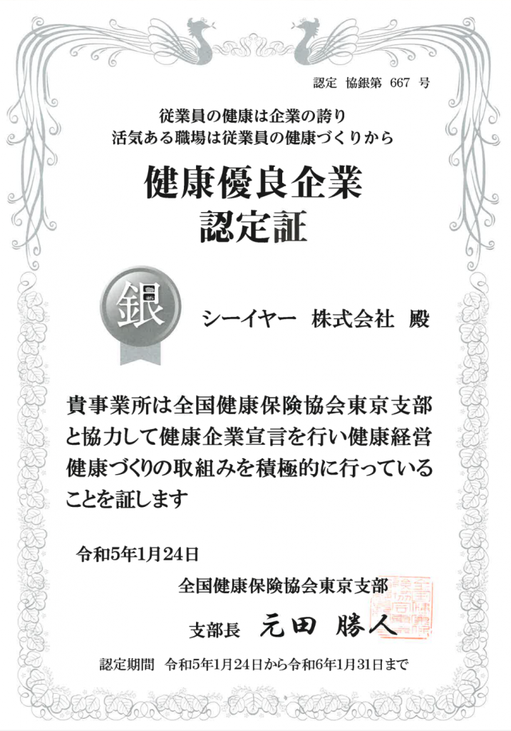 健康優良企業「銀の認定」を取得いたしました 2023.02.03 最新情報 シーイヤー株式会社は、全国健康保険協会東京支部に、「健康企業宣言」を行い健康経営健康づくりの取り組みを積極的に行っている企業として、令和5年1月24日付けで健康優良企業に認定され「銀の認定」を取得いたしました。 今後も、活気ある職場と社員の健康づくりの取り組みを、積極的に推進してまいります。 認定番号 667号認定期間:令和5年1月24日〜令和6年1月31日 ■関連リンク全国健康保険協会