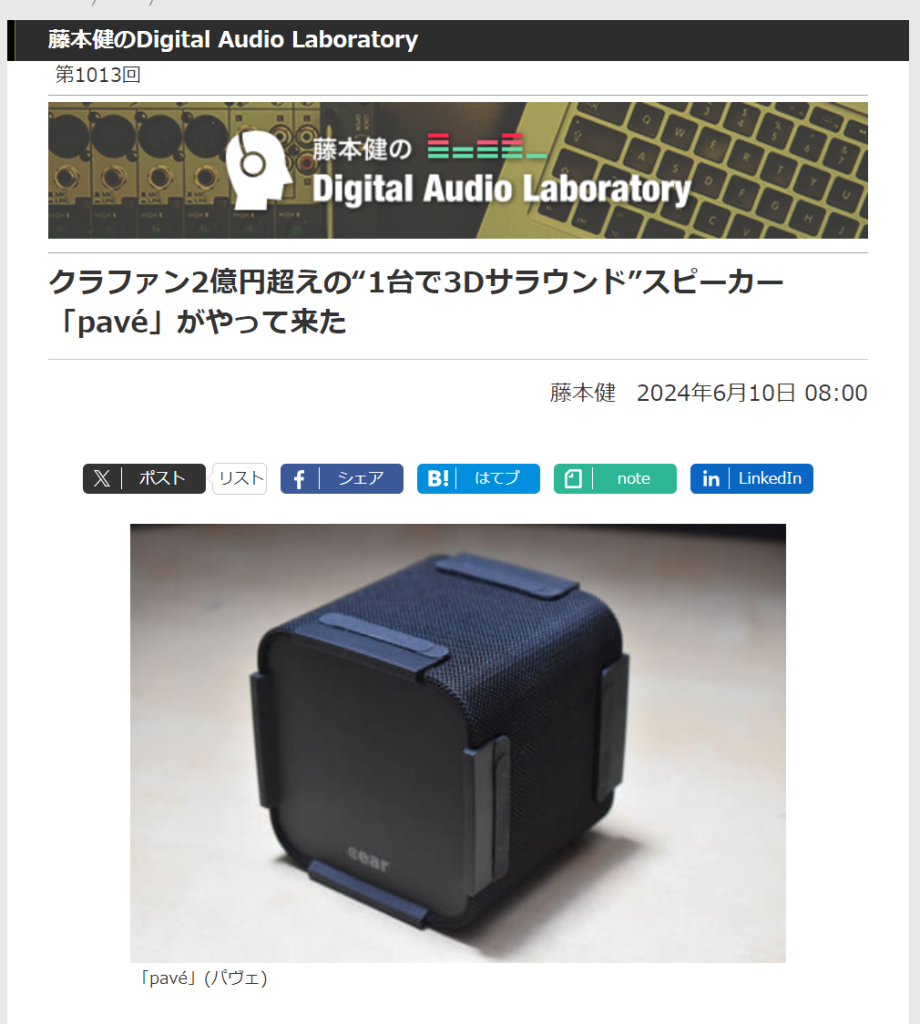 メディア掲載情報 2024.07.03 シーイヤーパヴェ 最新情報 7月 3, 2024 AV Watch 藤本健のDigital Audio Laboratoryクラファン2億円超えの“1台で3Dサラウンド”スピーカー「pavé」がやって来た